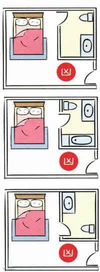 房间里的厕所对到床,情况比房门对到厕所严重,对到头,会头痛、思考时不能集中,住久了会产生肿瘤、中风等;对到腰,会腰酸、心脏无力、水肿,住久了会产生糖尿病、心脏病;对到脚,会坐骨酸痛、膝盖无力、痛风水肿,住久了会产生意外骨折。
