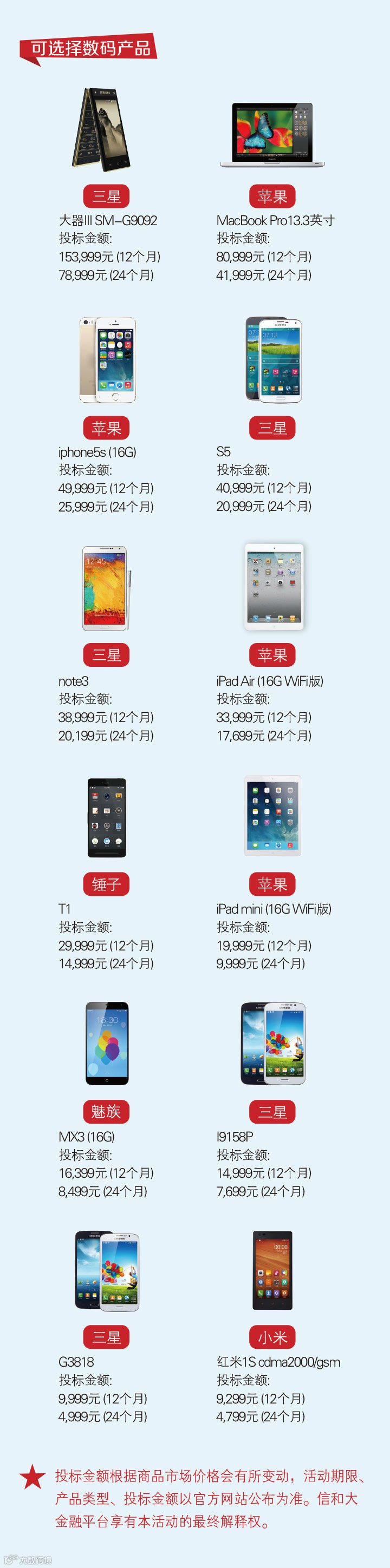 具体来说,加入“0元e计划”的用户,只需要一次性投入特定金额,如9999元,存放一定期限,如24个月,即可优先以0元获得iPad Mini(16G Wifi版),到期之后返还全部投入金额9999元。更有多款热门数码产品和多种投资方式可以选择。据悉,本次活动提供的数码产品十分“给力”,MacBook宽屏笔记本、iPad Air平板电脑、iPad mini平板电脑悉数参加;更有苹果、三星、小米、魅族等多个品牌不同机型的手机任凭选择,不论你想要实用的、时尚的、还是个性的,总有一款适合你。