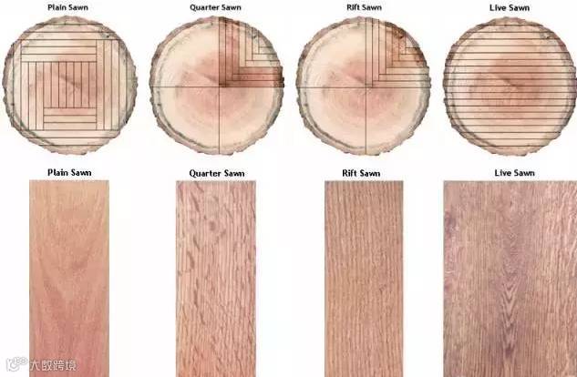 根据切割的方向不同,木材的基本锯法可分为四种:弦切法(Plain/Flat Sawn)、刻切法(Quarter Sawn)、径切法(Rift Sawn),平切(Live Sawn)。