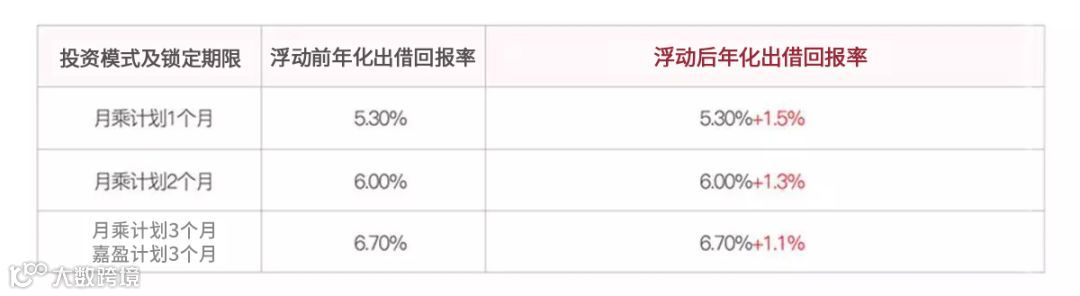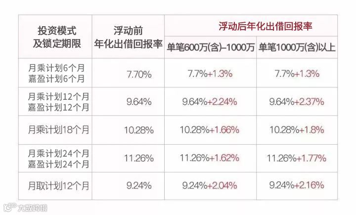 月乘计划1个月年化出借回报率为6.8%;月乘计划2个月年化出借回报率为7.3%;月乘计划和嘉盈计划3个月年化出借回报率为7.8%。