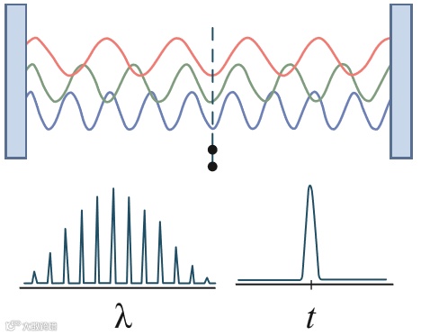 图 2:通过锁模产生超短脉冲(产生波长带宽很宽但时间宽度超短的脉冲)的基本概念