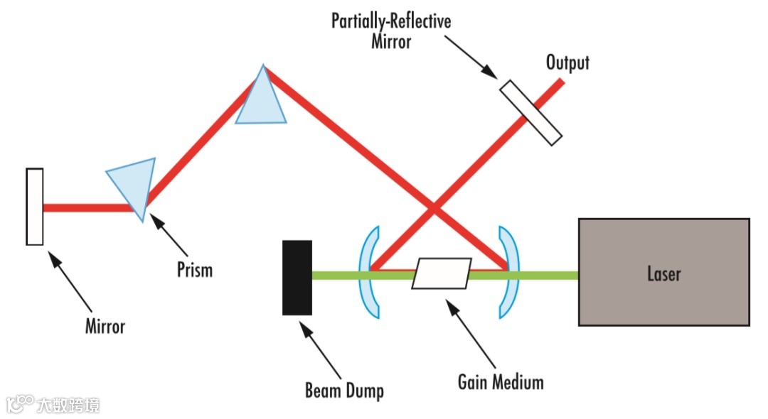 激光器的运作基于两项一般原理:使用增益介质(例如 Ti:sapphire 晶体)对光进行放大,以及使用腔体(例如两面反射镜)确保反馈。在受激增益介质中对光进行放大时,由于腔体存在反馈(部分透射),因此会产生强烈的激光束(图 1)。