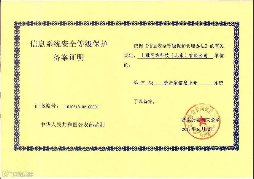 平台坚持稳健合规运营,主动拥抱监管,积极进行合规建设,早在监管备案通知下发之前就已获得国家信息安全等级保护三级备案。