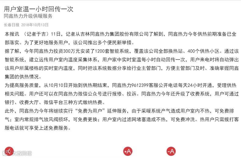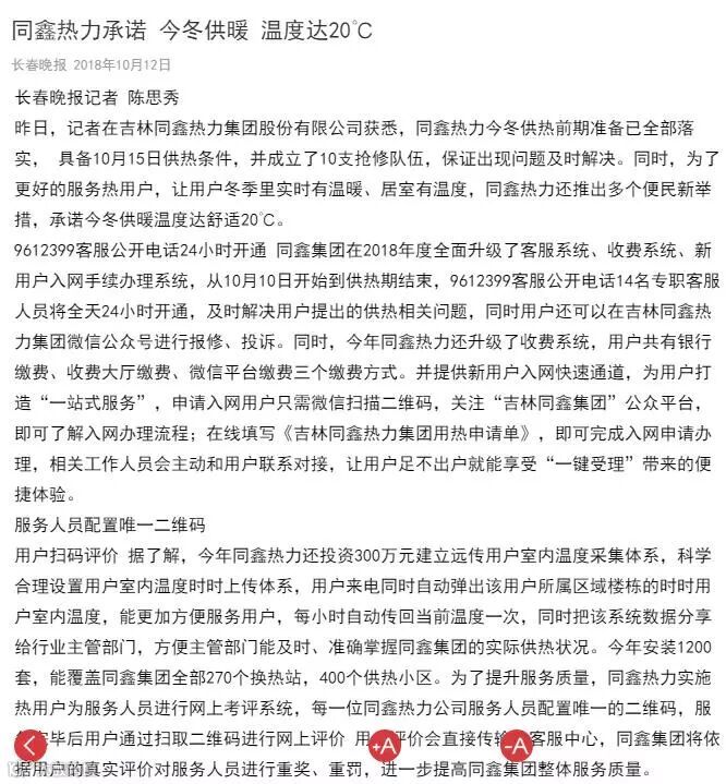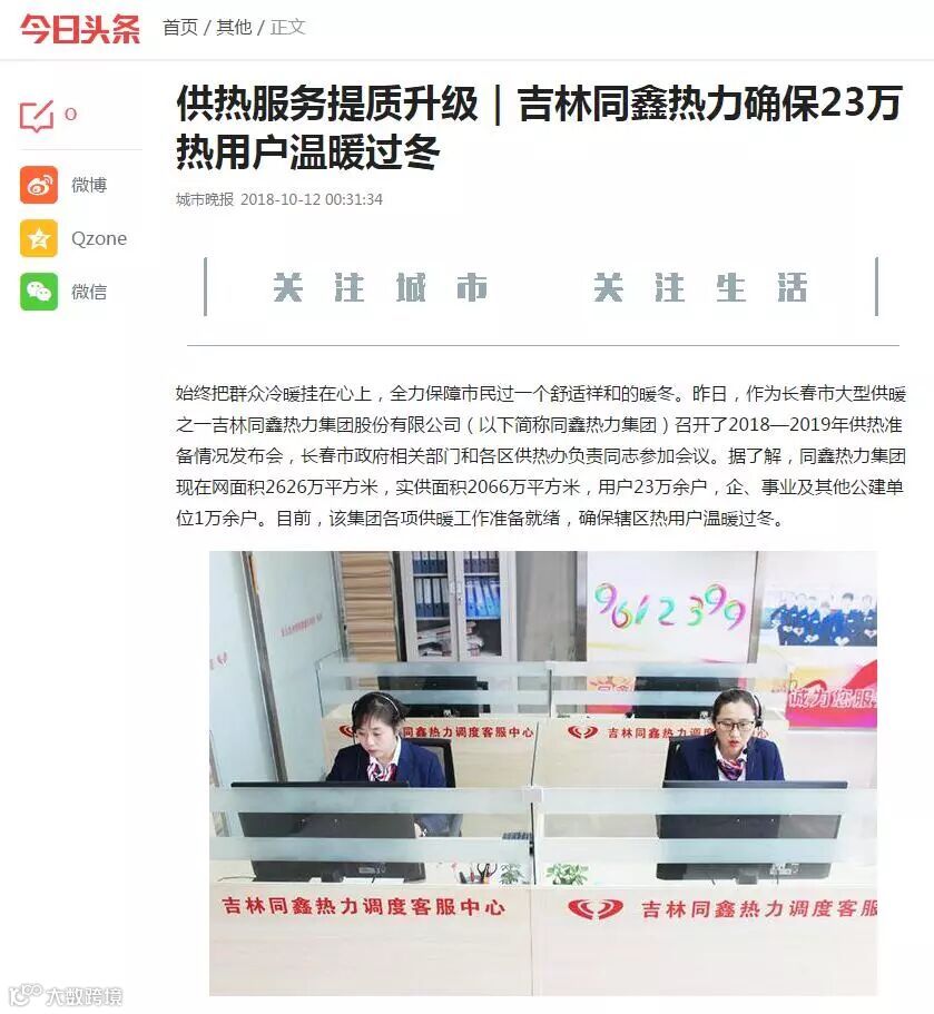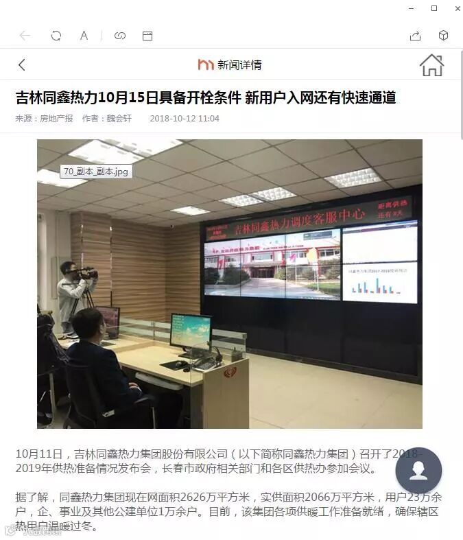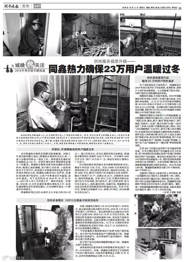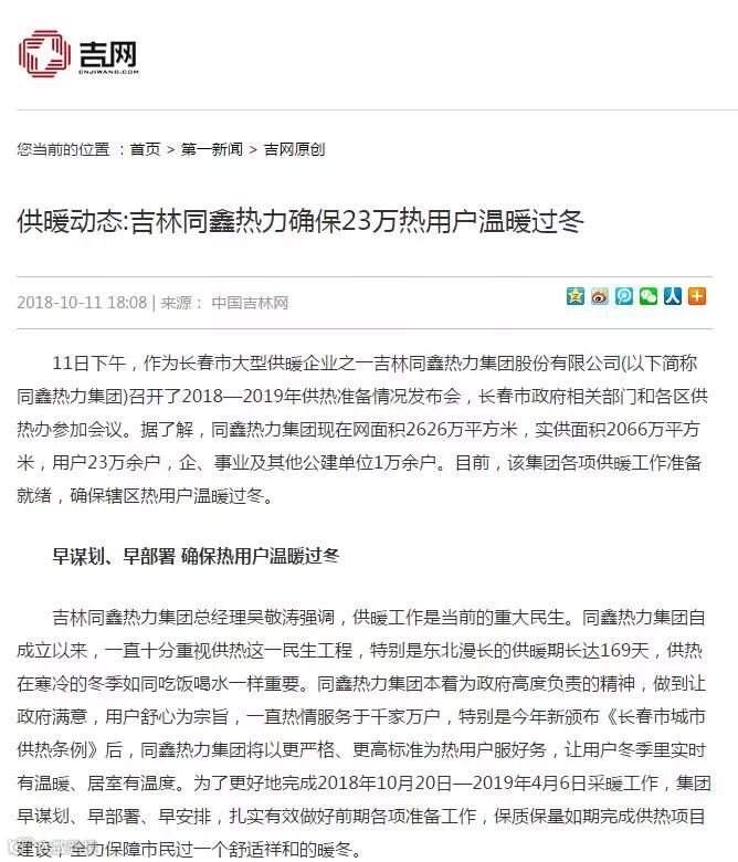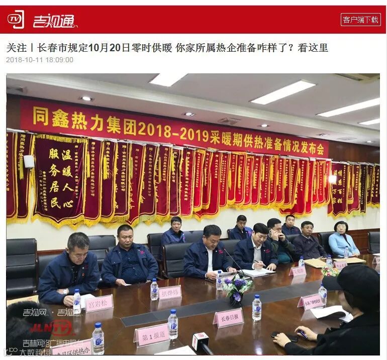 一.2018年10月11日同鑫热力集团召开供热准备发布会,市公用局、12345市长电话办公室、12319电话受理办公室、绿园区供热办、二道区供热办、朝阳区供热办、南关区供热办、净月区供热办等8个相关行业主管部门领导参加。吉林电视台新闻频道《第1报道》、守望都市、城市速递、长春广播电视台、中国吉林网、新文化报、东亚新闻、城市晚报、长春日报、长春晚报、长春房地产报、交通之声等12家新闻媒体参加,会上同鑫热力集团郑重向社会承诺:同鑫热力集团10月15日具备供热条件,按照政府规定按时供热。今年同鑫热力集团供热目标是:从达标性供热迈向舒适性供热。
