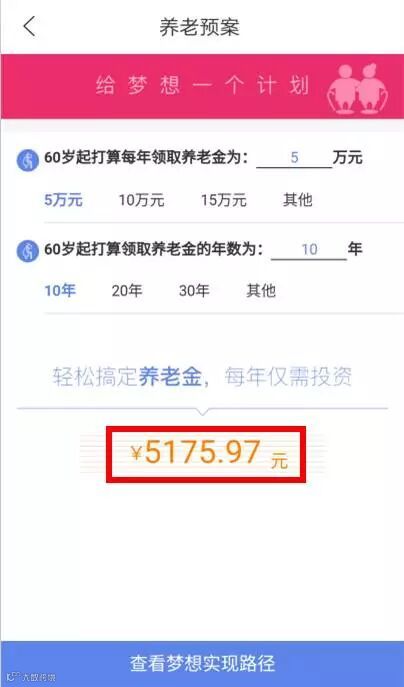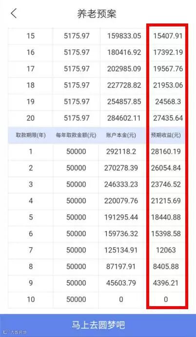 如果你现在40岁了,除了基本的社会保险之外,还想通过现有积蓄给自己多一份保障,你可以选择养老计划,每年只需投资5175.97元,就可以在60岁之后,每年取50000元,十年总共可以取500000元,是不是很厉害!!!复利的力量就是这么大哦~