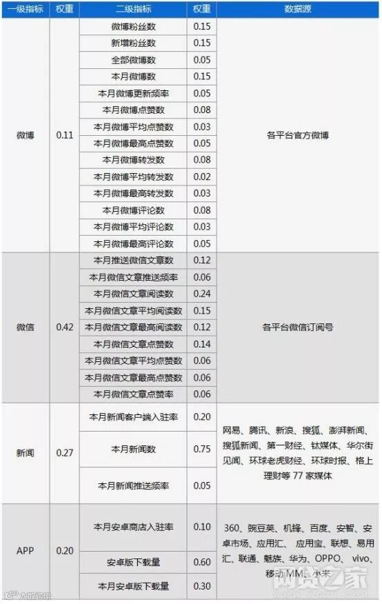 互金平台移动影响力榜单数据源、指标及权重