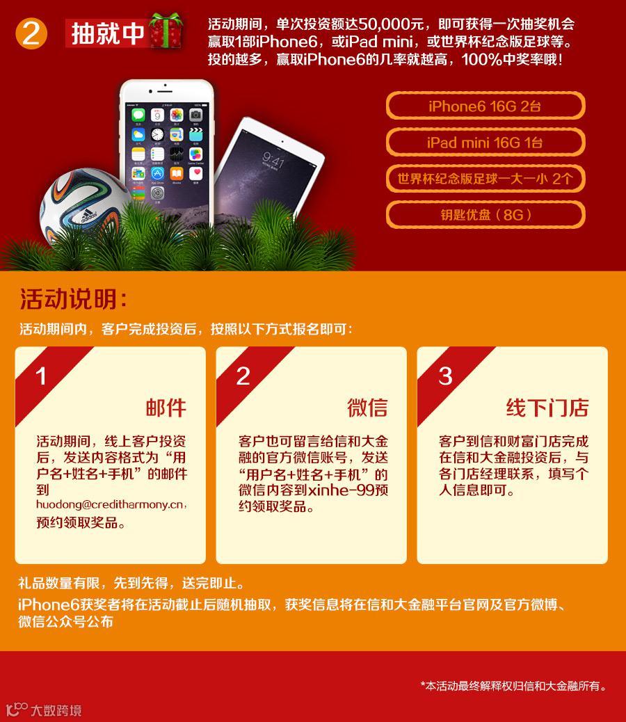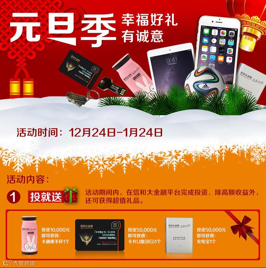 导读:迎新年,信和大金融开启2015“有礼”模式,一大波超值豪礼免费领啦!投就送,抽就中,真是太任性了!礼品数量有