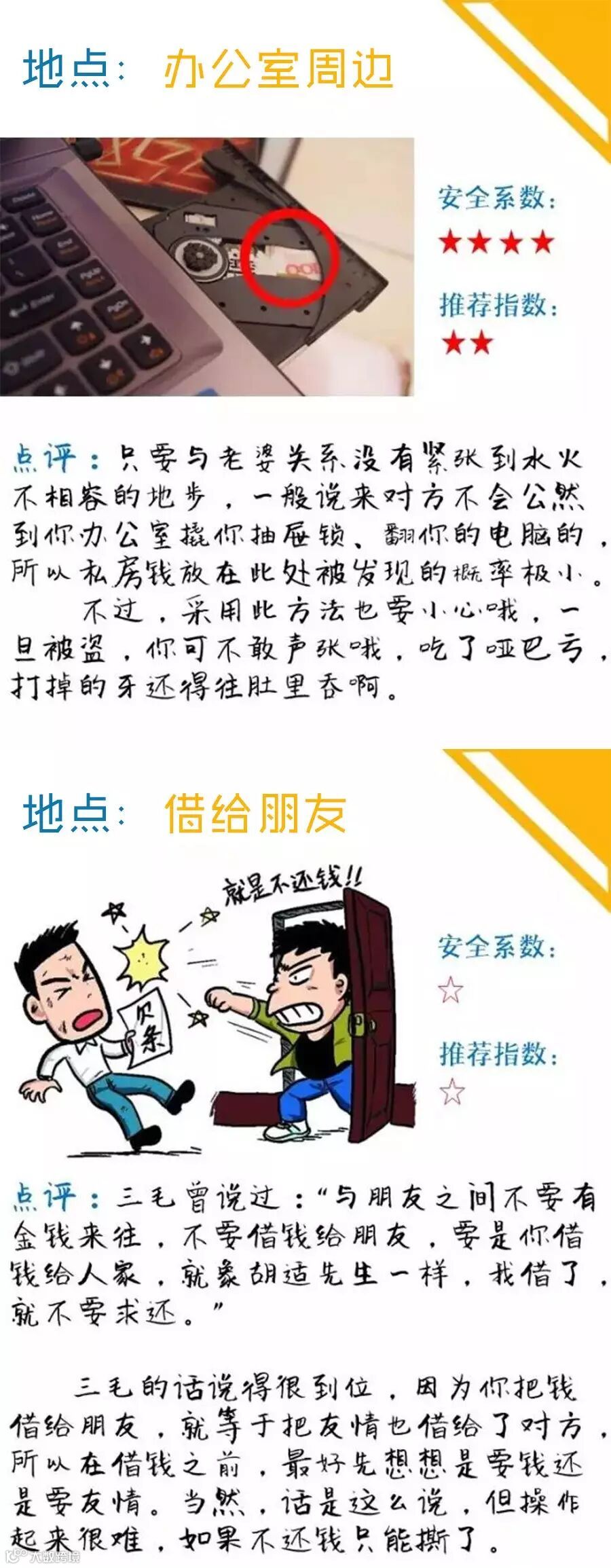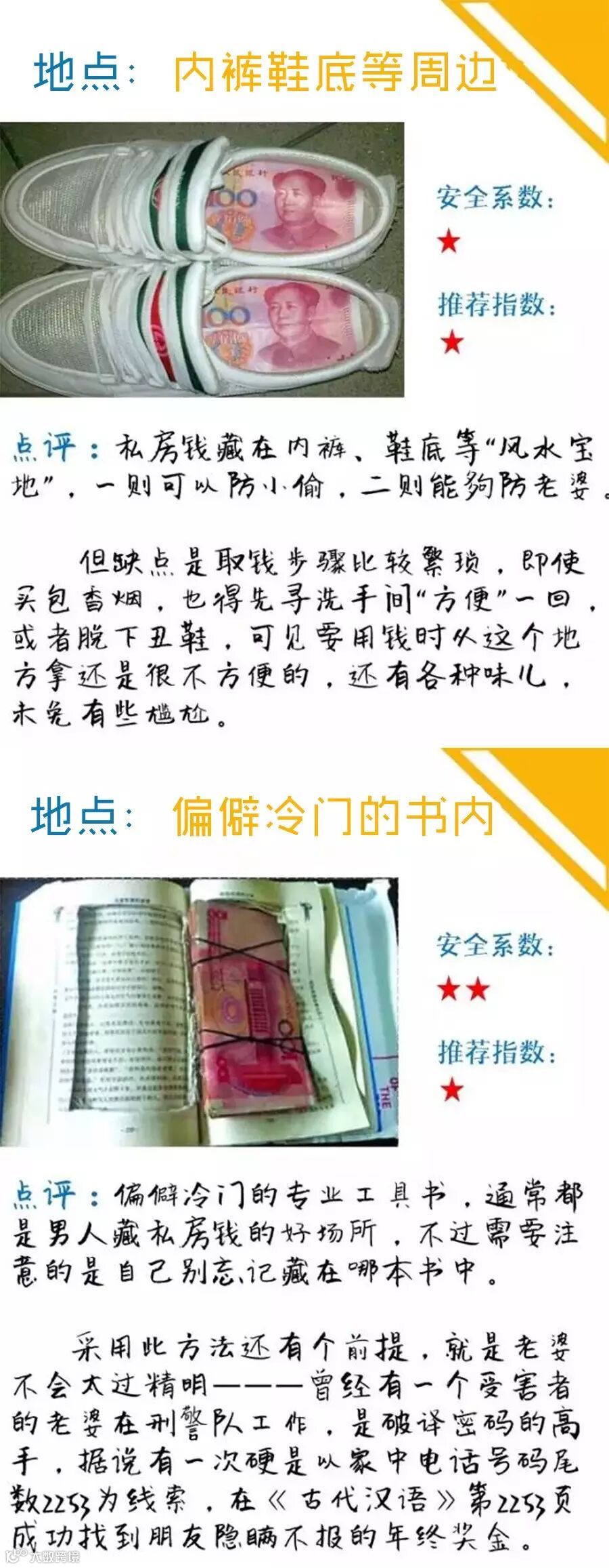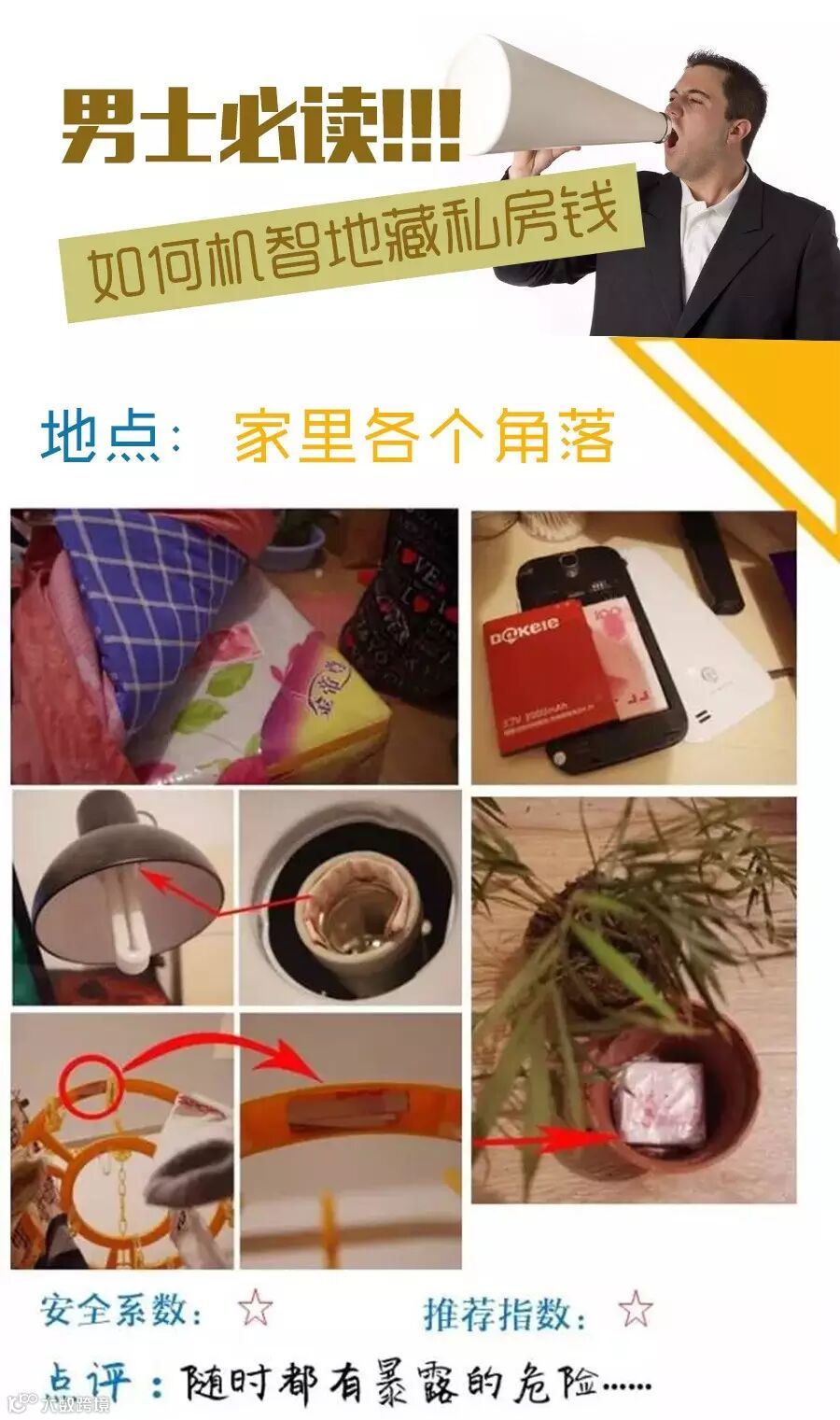 警方调查发现,这些钱是小镇一名男子的私房钱,正是因为他把钱藏在树上才发生如此怪事。看来如何藏私房钱是全世界男人共同面对的难题,为了让中国男士不再遇到此类悲剧,今天向大家推荐几处藏钱宝地,请大家根据安全系数和推荐指数选择适合自己的方式!