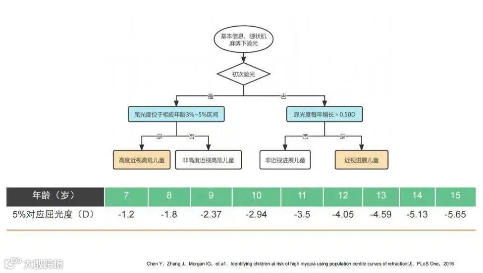 初次验光配镜的孩子,我们要看他散瞳后的验光度数是否在相应年龄的前3%-5%的区间,如果在这个区间,那他属于高度近视的高风险人群,需要选择特殊设计的框架眼镜。如果不在这个区间,那他不属于高度近视的高危儿童,可以选择普通的单光镜片。