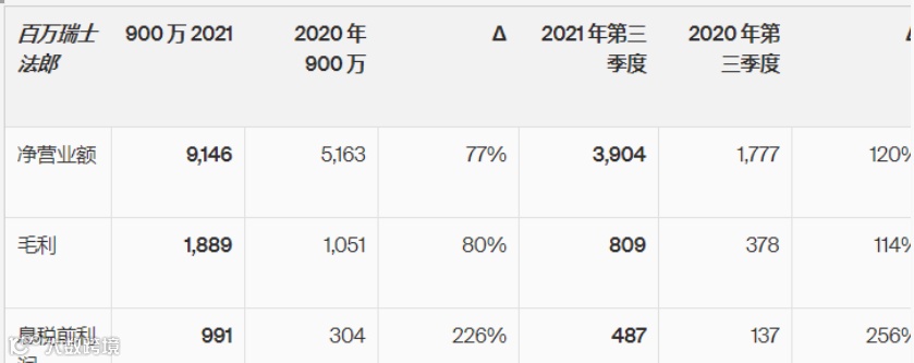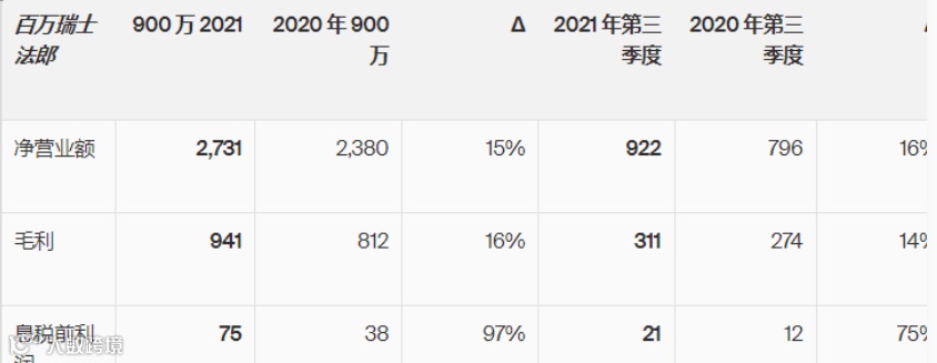 该部门2021年前三季度的净营业额达27.31亿瑞士法郎,息税前利润几乎翻了一番,达到7500万瑞士法郎。