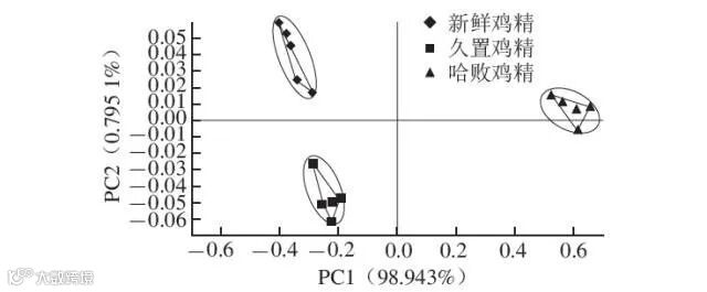 电子鼻对新鲜鸡精、久置鸡精、哈败鸡精可以有效区分。新鲜鸡精和久置鸡精更为接近,说明二者风味更为接近,这与感官评价结果一致。