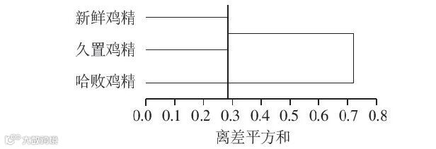 分析表明,新鲜鸡精、久置鸡精和哈败鸡精的感官属性(鸡肉味、油脂味、腥味、鲜味、苦味、腐败感和整体接受度)除油脂味均具有显著性差异(P<0.05),说明3个鸡精在嗅觉感官上的差异显著,人工感官评价可以很好地体现3种鸡精的不同感官特性。
