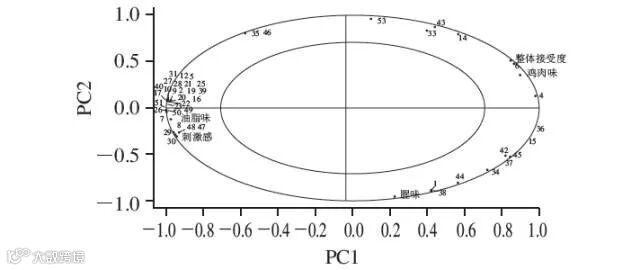 为了探究检测得到的挥发性风味物质对鸡精整体风味的贡献程度,利用PLS(Partial Least Squares)建立感官评定与挥发性风味成分的关系,从而推断每种风味成分与嗅闻感官属性的相关性,如图所示。