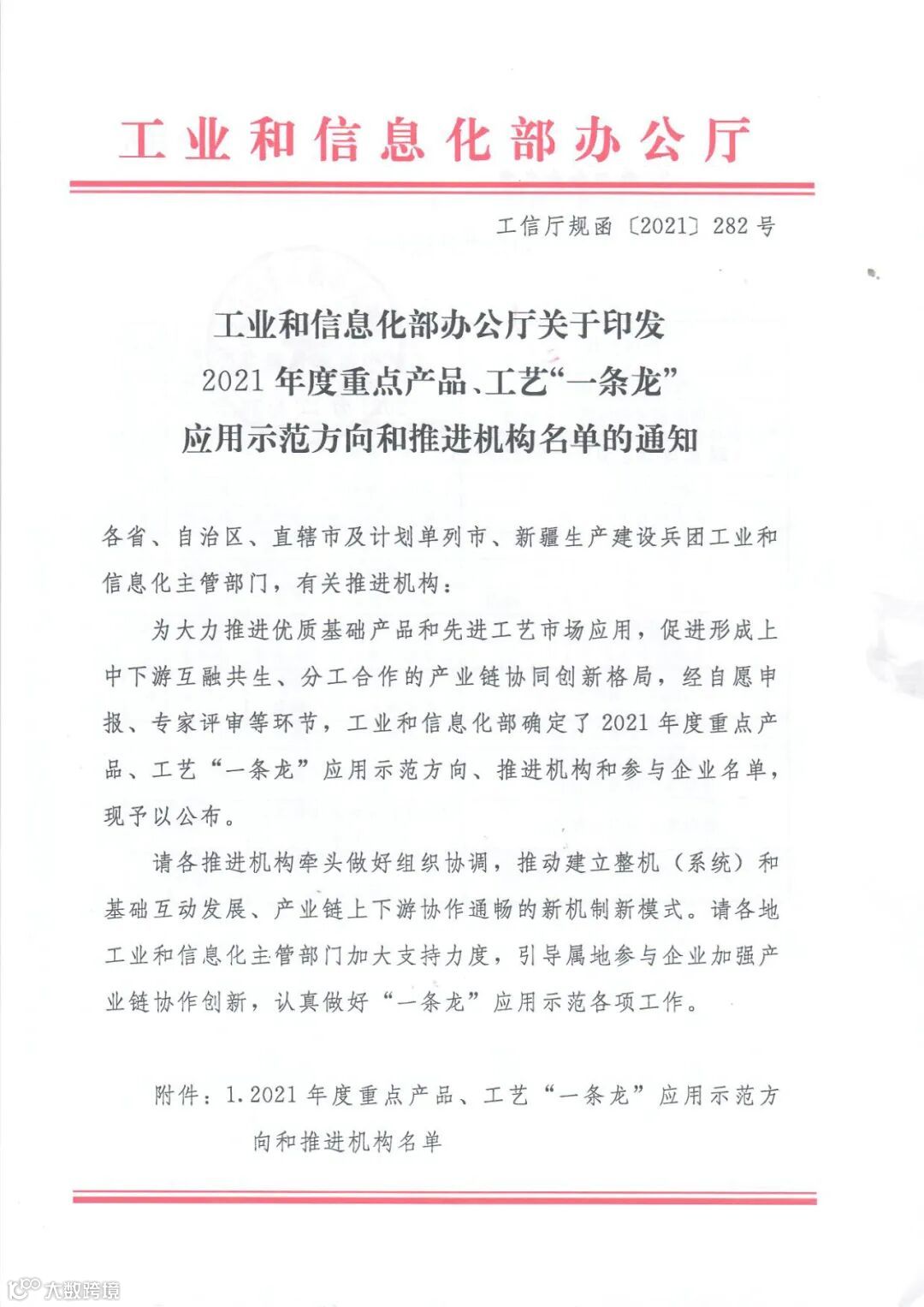 为大力推进优质基础产品和先进工艺市场应用,促进形成上中下游互融共生、分工合作的产业链协同创新格局,经自愿申报、专家评审等环节,工业和信息化部确定了2021年度重点产品、工艺“一条龙”应用示范方向、推进机构和参与企业名单。