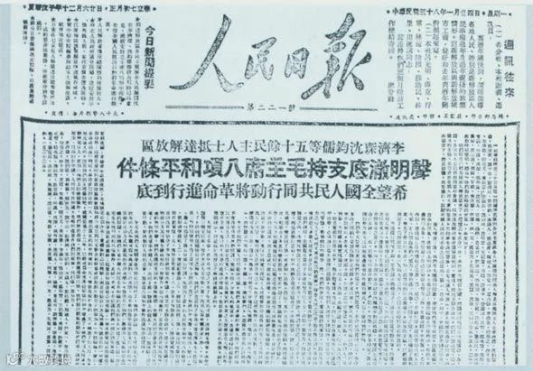1949年1月22日,李济深、沈钧儒等55人联名发表对时局的声明,拥护毛泽东提出的八项和平条件。这是《人民日报》的有关报道。