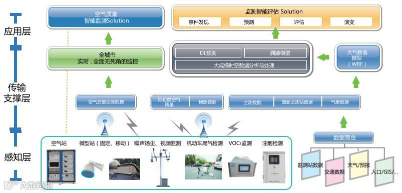 方案采用三层架构体系,即感知层、传输支撑层和应用层。数据经网格化感知设备采集后,通过信息传输支撑层网络上传到环保云计算平台,通过环保云平台和大数据计算挖掘,确定区域空气污染的主要成因和来源,并为预测预警,溯源及靶向治理等环保决策提供精准的大数据支持。
