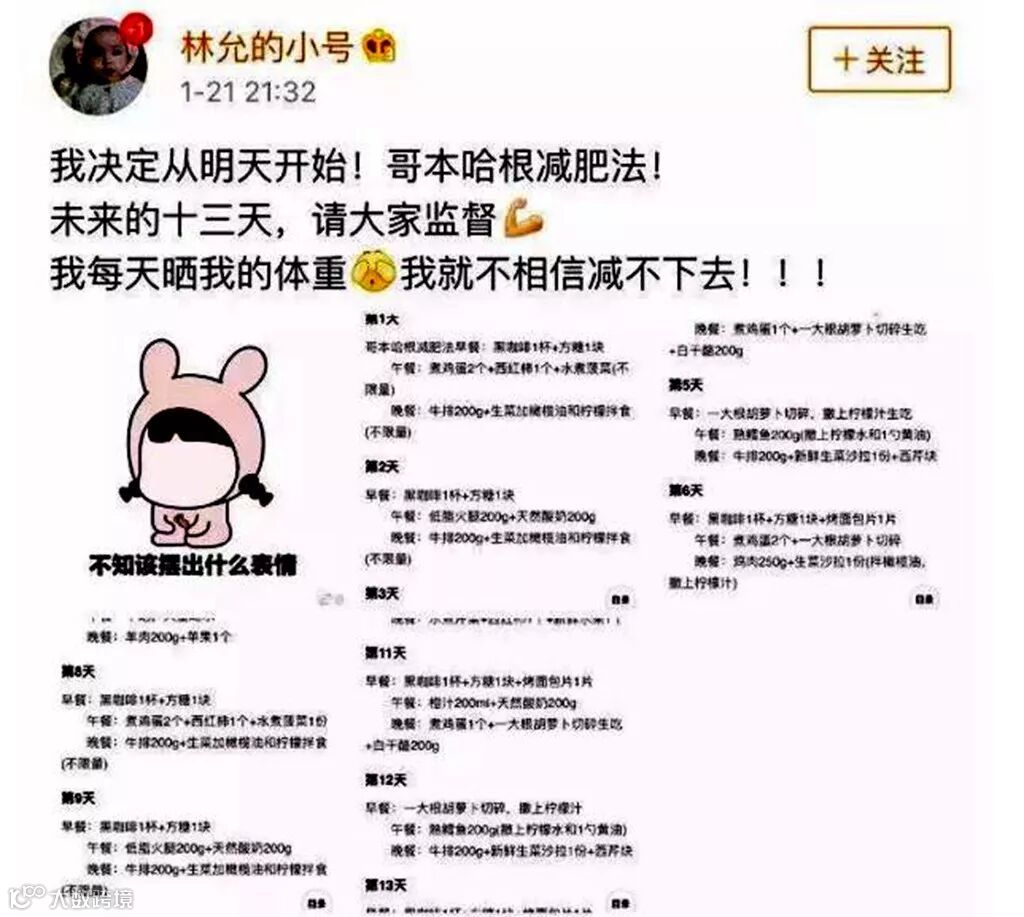别看林允微博上说的那么轻松,你以为女明星真的只是瘦着玩玩的吗?看看林允小号上记录的减肥历程,也是各种拼,关键是听起来相当不健康,从1月小号开张,她就开始尝试网红减肥法~