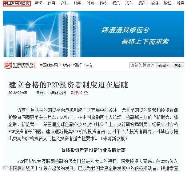 目前,金融投资者群体自我保护意识不足,建立合格投资人制度任重而道远。近日,中国财经网刊发了“建立合格的P2P投资者制度迫在眉睫”一文。文章认为,合格投资者建设是行业发展所需,也是保护投资者的需要。