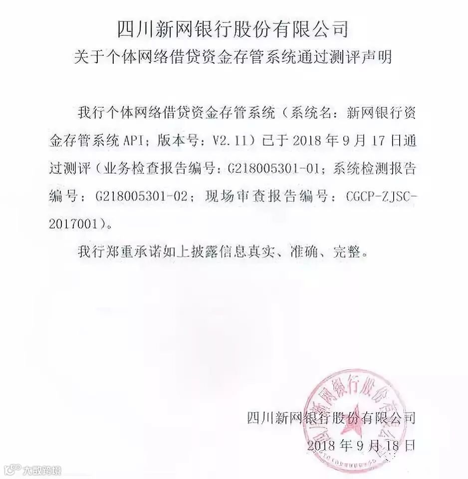 以下为新网银行发布的“关于个体网络借贷资金存管系统通过测评声明”原文截图: