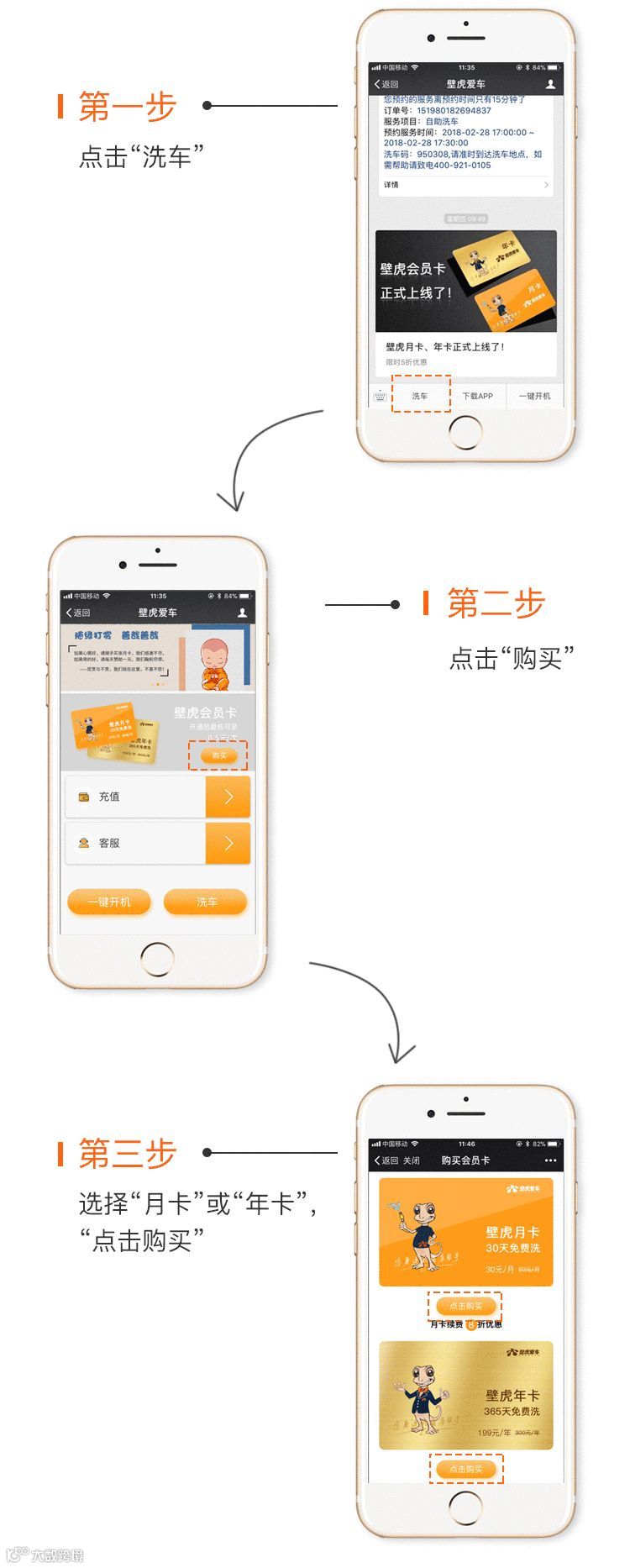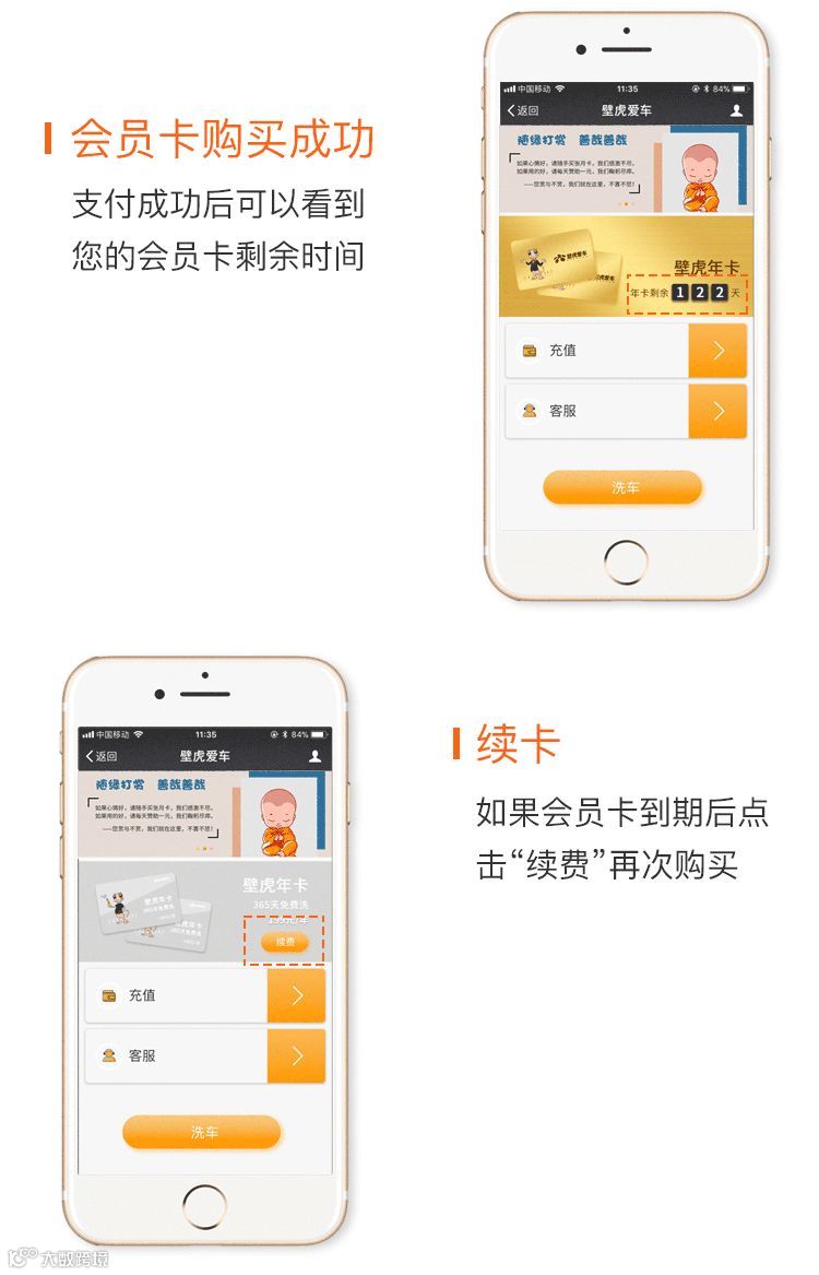 点击我们的公众号,点击洗车跳转首页后,点击会员卡图中的购买,选择月卡或者年卡进行购买