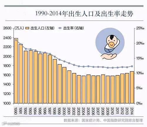 这其中,当然有人口的因素,从1990年到2014年,中国的出生人口和出生率一直往下跌。1990年生的人,现在28岁,那一年中国有近2400万人口出生。到了1996年,全国人口出生率掉到了16.98‰,相比1987年的23.33‰下降了约6个百分点。出生率到2010年、2011年到了谷底,只有11.9‰。2015年10月,国家实施了全面二孩政策后,2016年出生率有所回升,但也只回升了不到1‰。