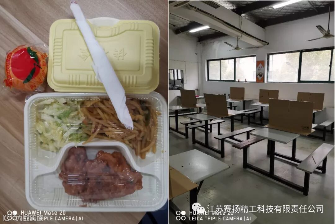 在严密防守外部危险进入厂区的同时,厂区内依然采取了严密的消杀防护措施。进入厂区的人员除了用餐外,必须全天佩戴口罩。每日固定的晨会也由会议室转移到了线上。对食堂、办公室、洗手间等公共区域每日进行两次以上消毒。尤其是食堂,除了每日三次的固定消毒外,还使用硬纸板对餐桌进行隔挡处理,同时采用发放盒饭的方式确保用餐人员全程无交流。各部门人员分批次用餐,避免集中用餐发生交叉感染。