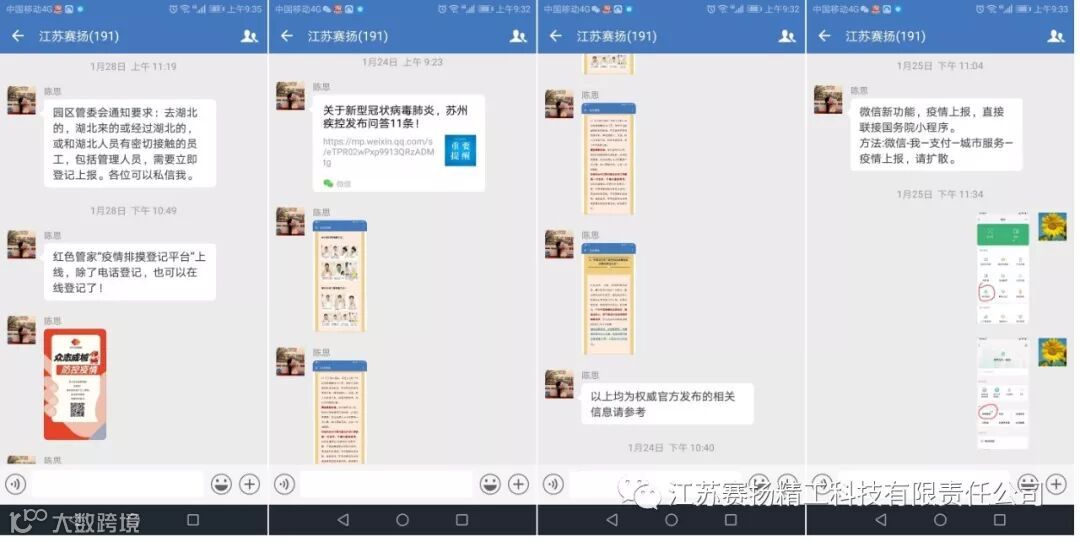 公司管理人员在企业微信群中及时发布各类与疫情防控相关的官方公告,组织员工线上学习,从疫情知识的认知到疫情防控的注意事项;从口罩的选择和使用方式到疫情上报的方法;从流动人员返苏须知到返苏人员交通注意事项!同时也组织员工通过视频课件,线上学习关于新型肺炎防控方法。让员工及时了解、及时关注、及时防护。让“大家”从心理上和行动上一起打赢这场疫情战!