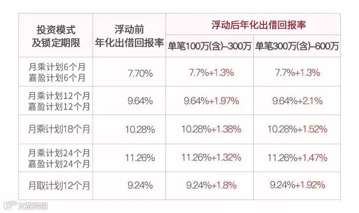月乘计划1个月年化出借回报率为6.8%;月乘计划2个月年化出借回报率为7.3%;月乘计划和嘉盈计划3个月年化出借回报率为7.8%。