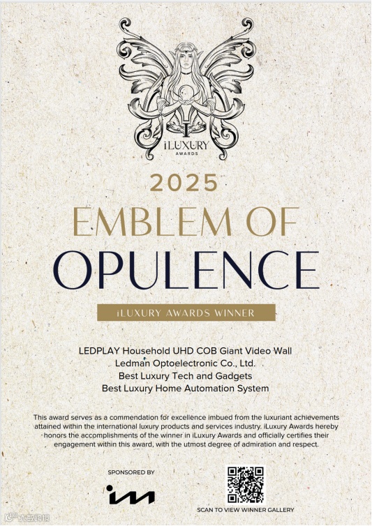 近期,在国际奢侈品设计领域权威奖项——iLuxury Awards的评选中,雷曼Micro LED家庭巨幕墙凭借独树一帜的家居美学与精益求精的工艺品质,从全球众多优秀作品中脱颖而出,荣获iLuxury 国际奢侈品设计奖。