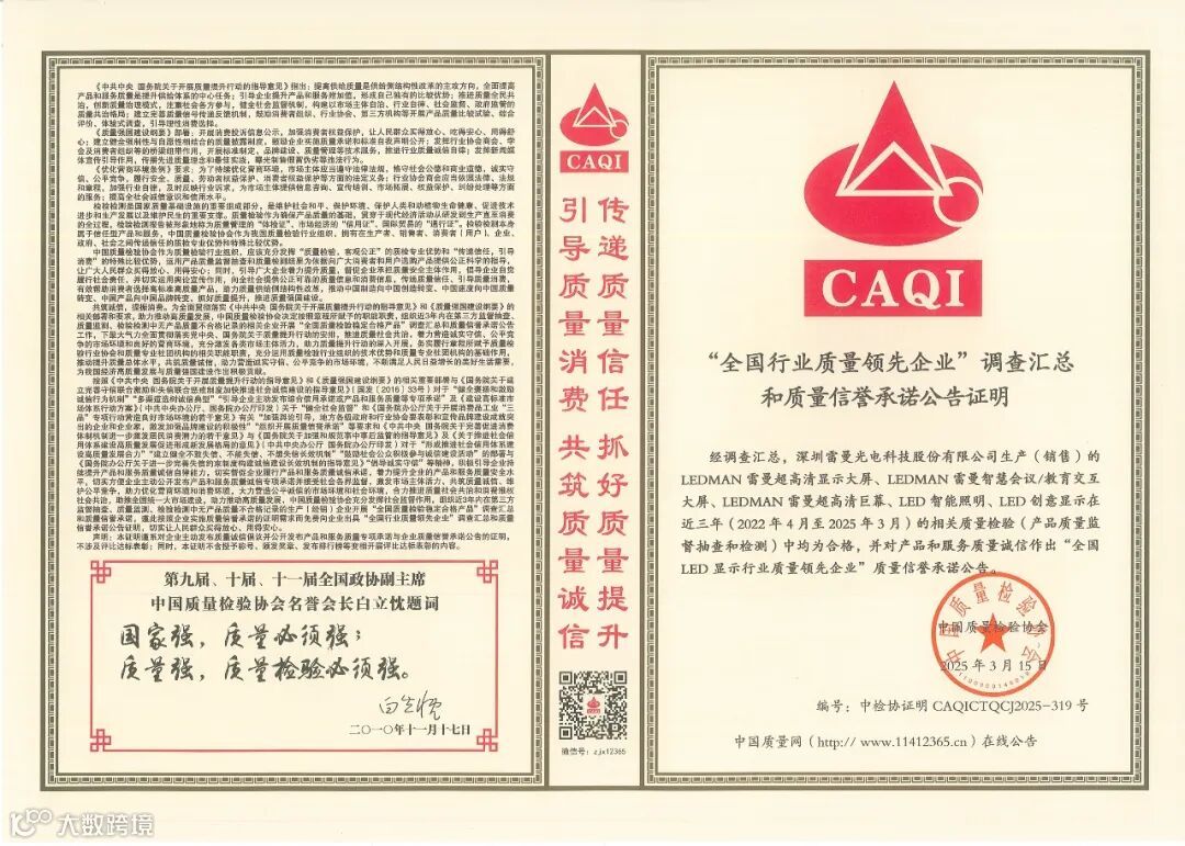 315“国际消费者权益日”如约而至,雷曼光电凭借卓越的产品质量与行业影响力,斩获“全国质量检验稳定合格产品”“全国产品和服务质量诚信承诺企业”“全国行业质量领先企业”等多项权威认证。这不仅是对雷曼光电品质的认可,更是对“中国智造”硬核实力的生动诠释。