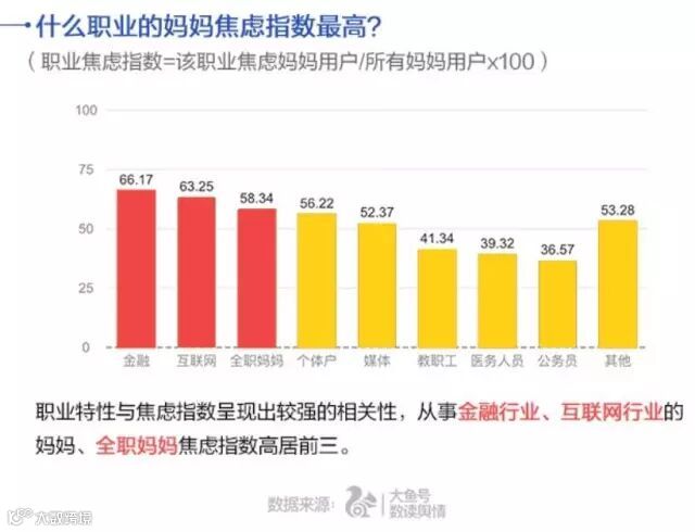报告显示,工作压力越大的妈妈,焦虑指数越高,其中从事金融、互联网行业的妈妈,焦虑人数远超其他行业。