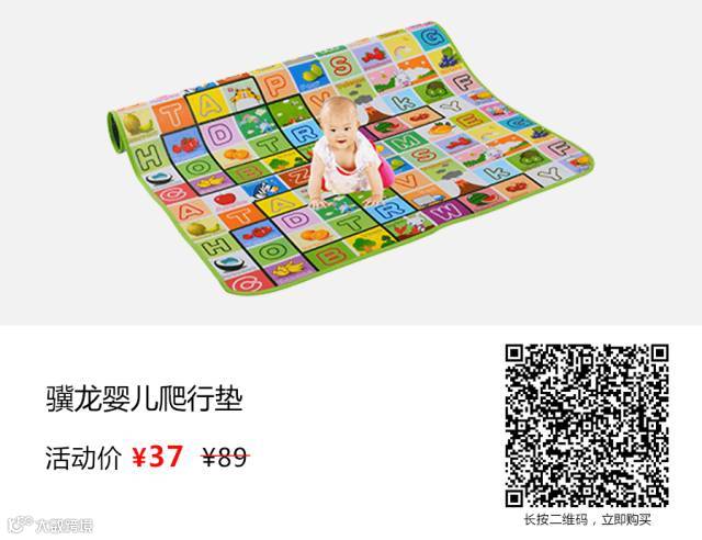 宝宝学爬时,谁最累?当然是妈妈,又怕宝宝磕着碰着,又怕地太脏,骥龙这款婴儿爬行垫,完美缓解妈妈的担心。环保材料,有效防滑,同时多款图案设计,字母、水果,宝宝爬行时,干净健康,还能学习,何乐不为?