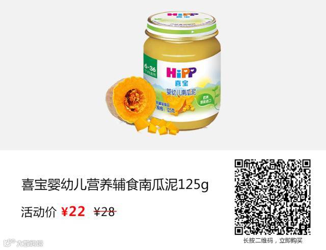 4-6个月,就可以给宝宝喂辅食了。喜宝南瓜泥,富含丰富的胡萝卜素和维生素,容易吸收,最重要的是,宝宝很喜欢南瓜甜甜的味道哦~对了,喜宝南瓜泥搭配喜宝奶粉使用,宝宝营养更均衡。