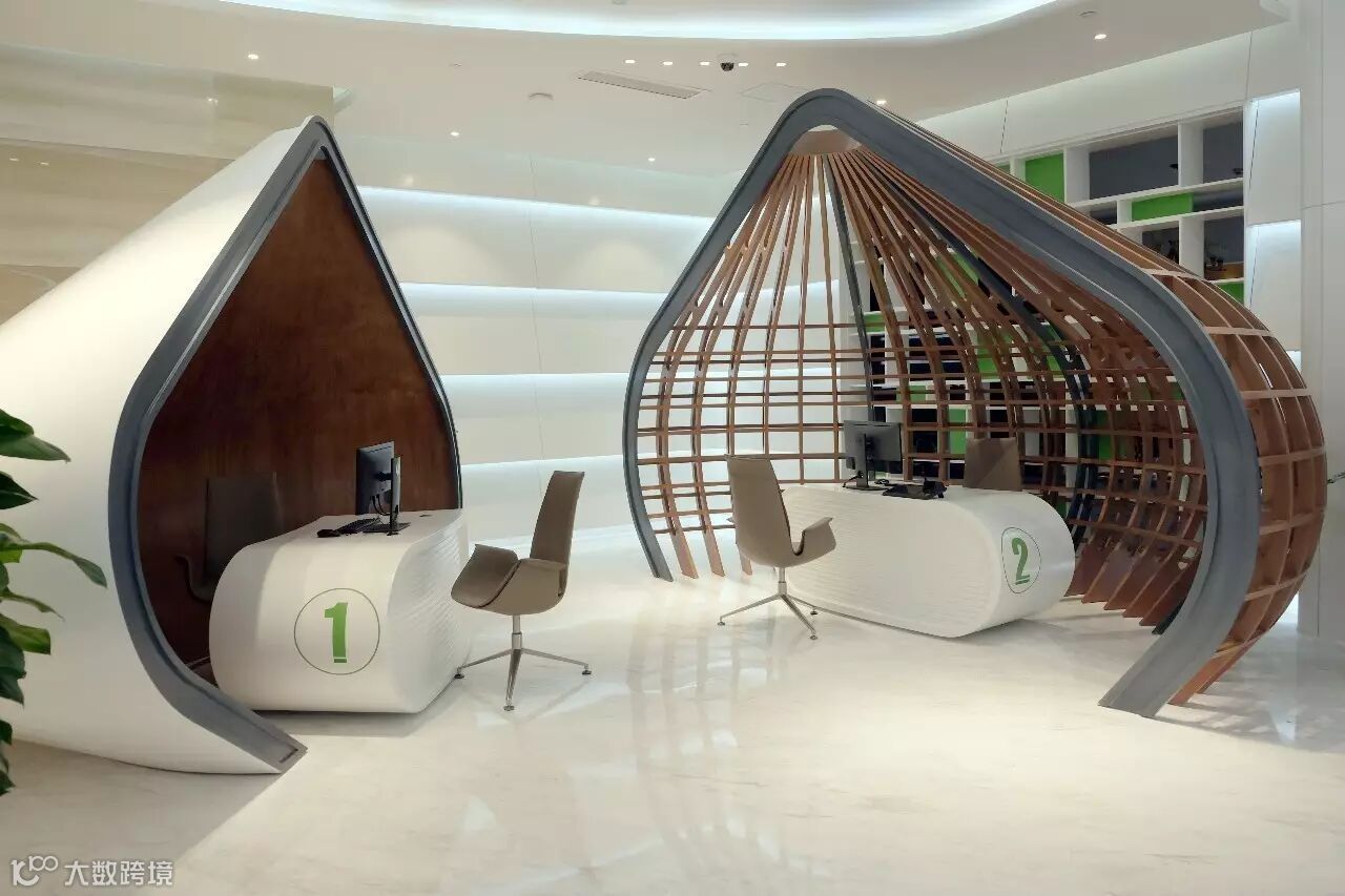 区别于传统银行黑灰色调为主的成稳格局,新网银行总部办公区以橙色、绿色等跳跃式色调为主,整个办公区以互联网化风格为主,喜庆型标志物、开放式柜台、栗子状理财区、人脸识别授信、VR功能体验等,都显示出新网银行新一代互联网银行的开放、创新、包容等特性,同时人工智能、生物技术又彰显了科技驱动金融发展的理念。