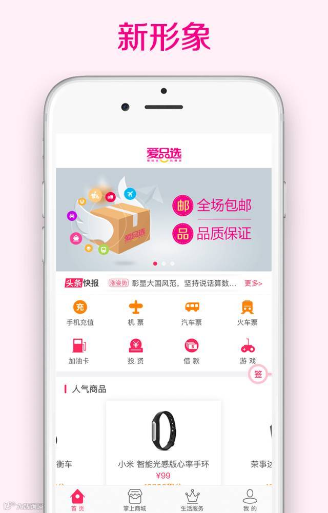 在应用层面上,爱品选新版APP2.0分为“首页”“掌上商城”“生活服务”“我的”四大版块,版块划分清晰明了,生活服务、人气商品、新品推荐、积分专区、热门活动、头条快报等信息一目了然,让用户能够快速交互,畅享移动电商消费的乐趣。