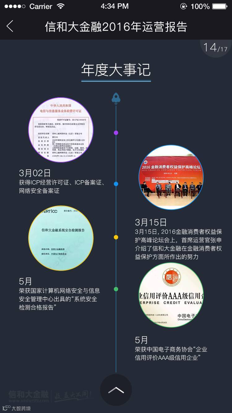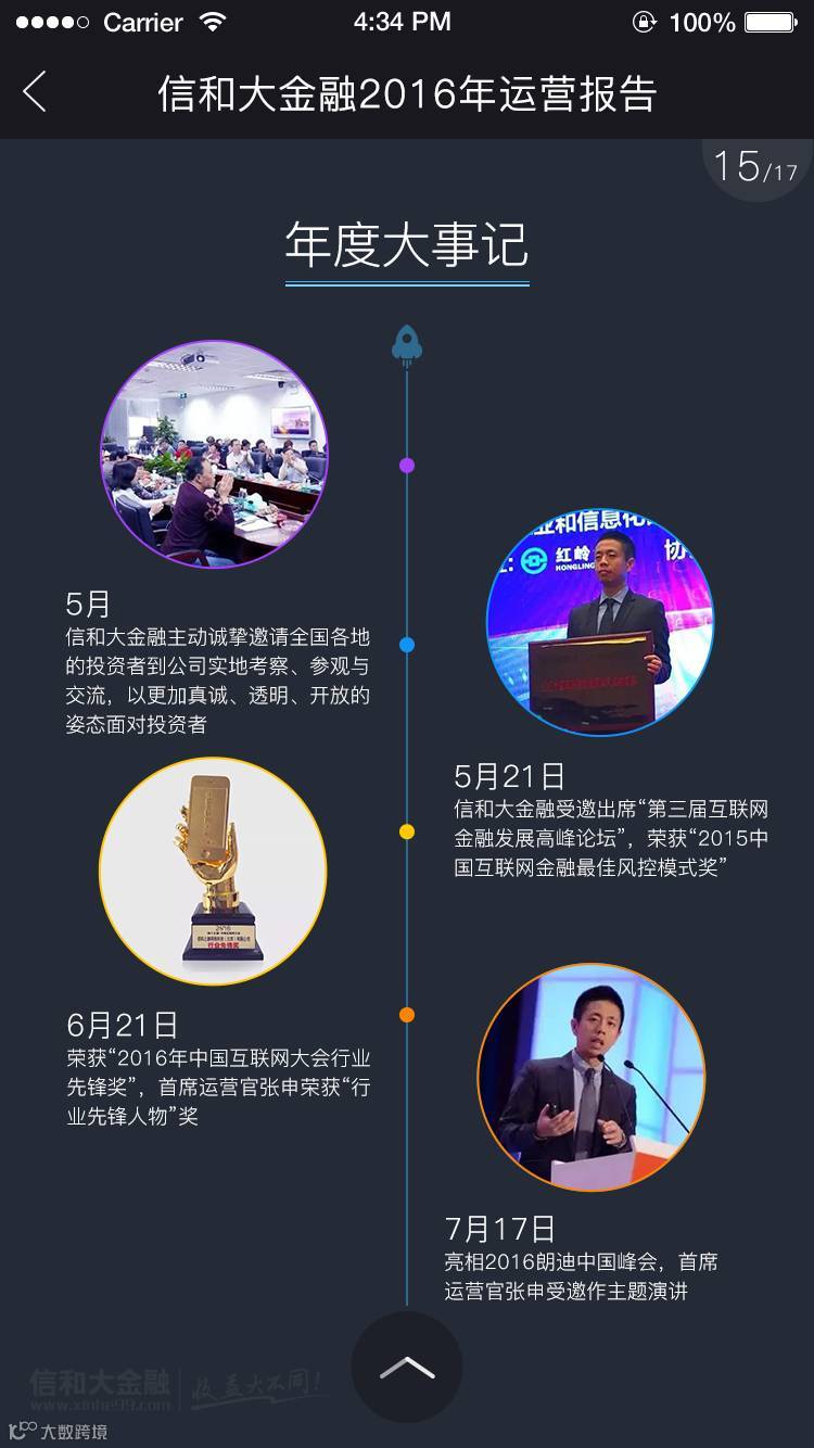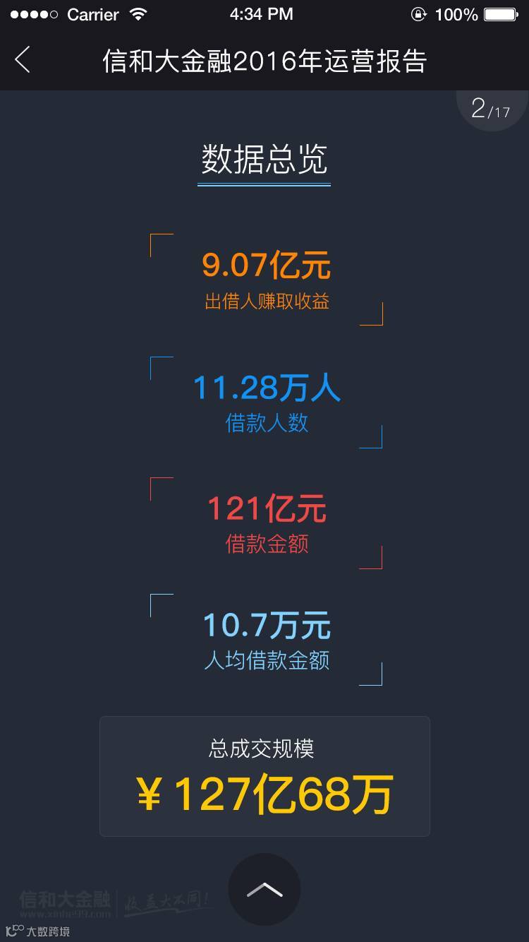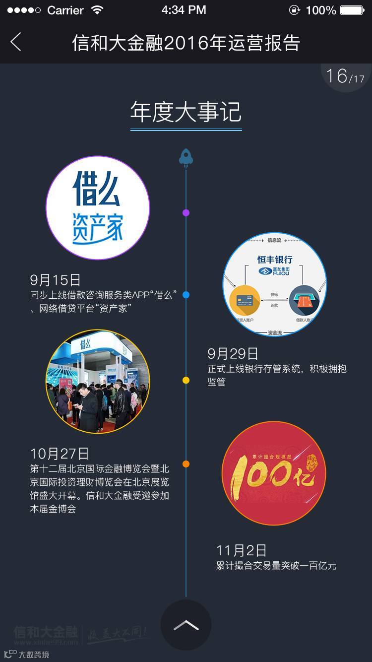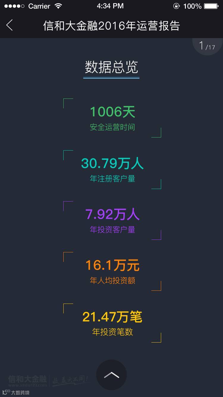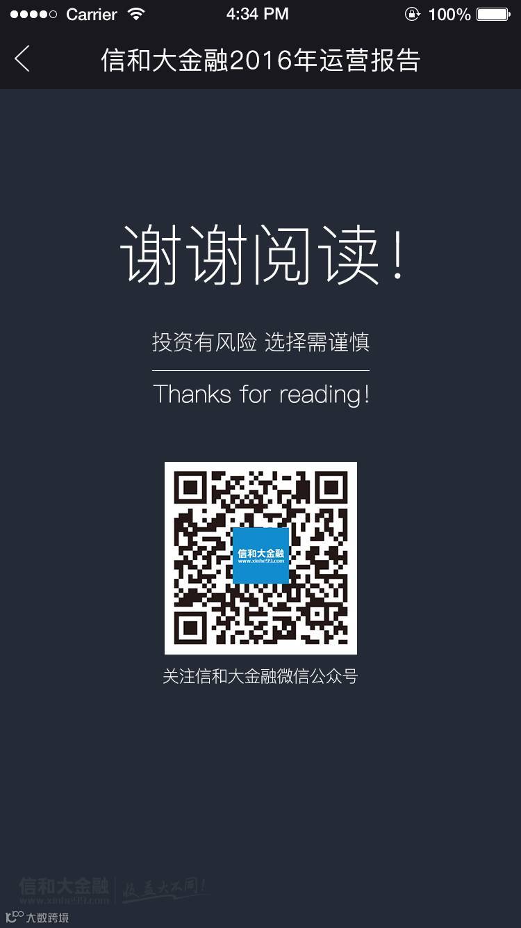 展望2017,承载着58万平台用户的期冀,背负着万千家庭的财富梦想,信和大金融将始终与您同在,风雨同路,携手前行!此刻,我们诚挚为您交上一份过去一年的答卷——《信和大金融2016年运营报告 》,敬请查阅!
