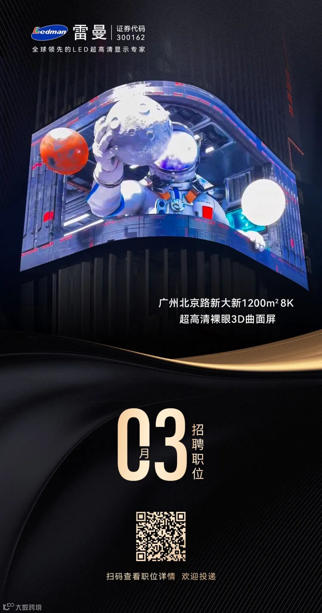深圳雷曼光电科技股份有限公司(证券简称:雷曼光电,证券代码:300162)成立于2004年,雷曼专注于8K超高清视频产业,助力5G+8K发展,以基于COB先进技术的8K Micro LED超高清显示产品为龙头,联动打造LED全系列产品和解决方案生态。