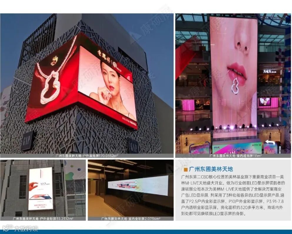 作为行业创意LED显示屏领航者的雷曼康硕展为美林M·LIVE天地提供了全解决方案商业广告LED显示屏,采用了P2.5户内全彩显示屏、P10户外全彩显示屏、P3.91-7.8 户内透明全彩显示屏等3种功能各异的LED显示屏产品,亮化面积约320多平方米,全方位的为整个商业体赋能,提升商业价值,商场内外到处都可见康硕展LED显示屏的身影。