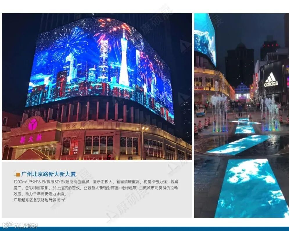 广州北京路新大新大厦1200㎡8K超高清裸眼3D曲面屏,显示面积大,画面清晰度高,视觉冲击力强,视角宽广,色彩绚丽浓郁,加上逼真的音效,凸显新大新辐射商圈+地标建筑+主流城市消费群的拉动效应,助力千年商街活力永续。
