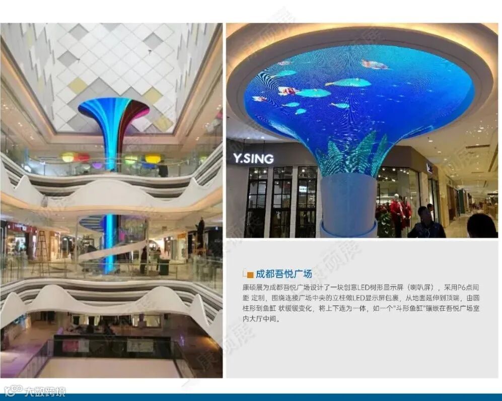雷曼康硕展为成都吾悦广场设计了创意LED树形显示屏(喇叭屏),采用P6点间距定制,围绕连接广场中央的立柱做LED显示屏包裹,从地面延伸到顶端,由圆柱形到鱼缸状缓缓变化,将上下连为一体,如一个“斗形鱼缸”镶嵌在吾悦广场室内大厅中间。