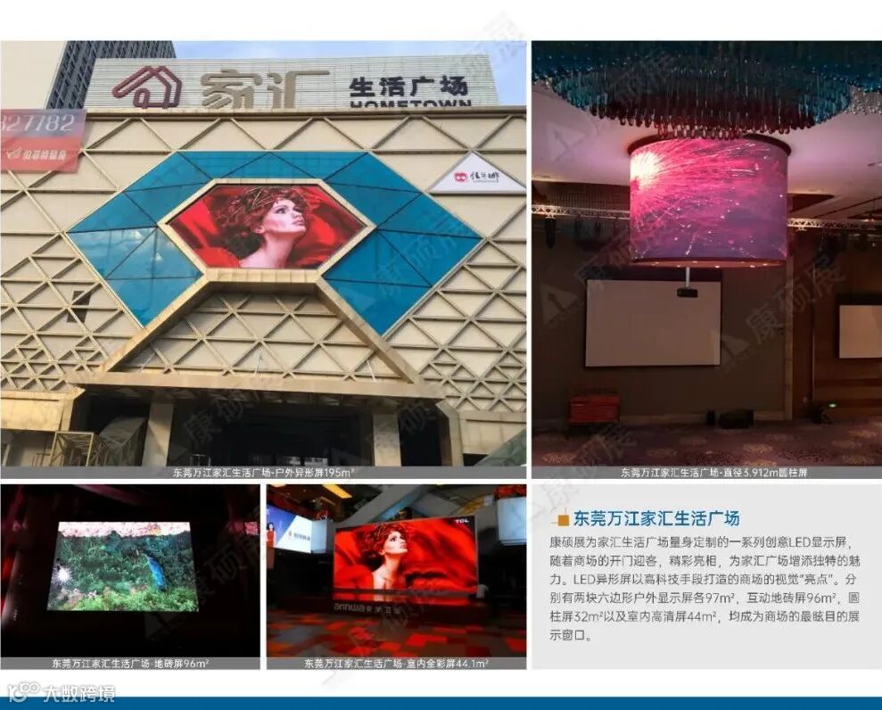 雷曼康硕展为东莞万江家汇生活广场量身定制了总面积达366 m²的创意LED显示屏,随着商场的开门迎客,精彩亮相,为家汇广场增添独特的魅力。LED异形屏以高科技手段打造商场的视觉“亮点”,两块97m²的六边形户外显示屏、96m²的互动地砖屏、32m²的圆柱屏以及44m²的室内高清屏,均成为商场眩目的展示窗口。