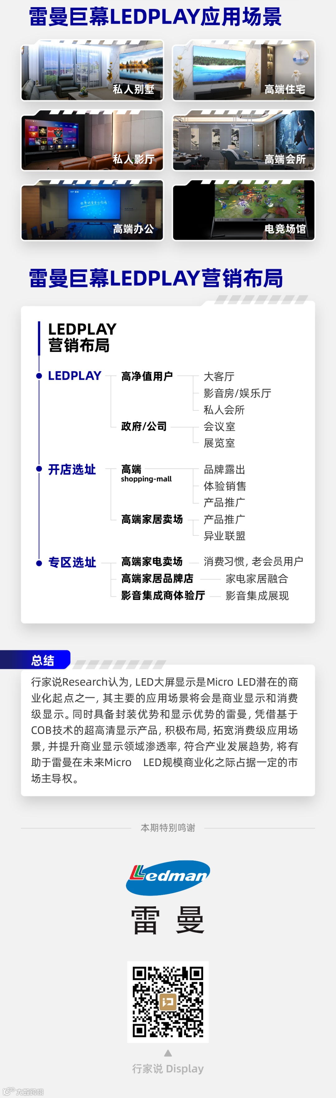 行家说Research认为,LED大屏显示是Micro LED潜在的商业化起点之一,其主要的应用场景将会是商业显示和消费级显示。同时具备封装优势和显示优势的雷曼,凭借基于COB技术的超高清显示产品,积极布局,拓宽消费级应用场景,并提升商业显示领域渗透率,符合产业发展趋势,将有助于雷曼在未来Micro LED规模商业化之际占据一定的市场主导权。