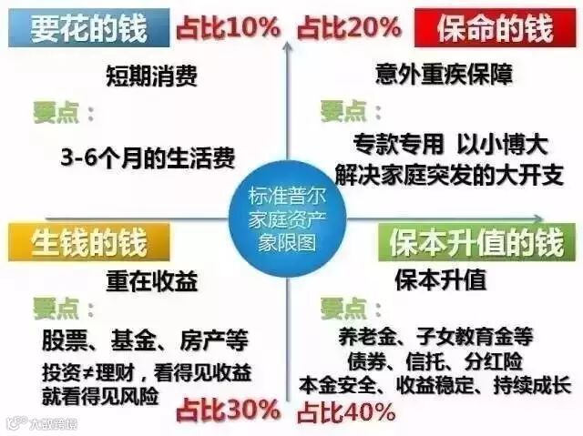 资产配置就像是足球比赛的教练排兵布阵一样。在守门员和后防线上,要配置一些余额宝、存款、债券基金、银行理财产品等,组成家庭资产中可靠的后防中坚力量。在中场,就要考虑有攻有守,攻守兼具的投资品种,比如信托、互联网金融等。前锋线上,可以买些收益率较高的股票或股票型基金。