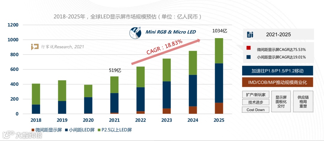 据行家说产研中心数据表示,2021年显示屏行业重回增长轨道,微间距显示增速最快。据估算,2021年显示屏产业产值有望突破500亿,2025年有望突破1000亿。