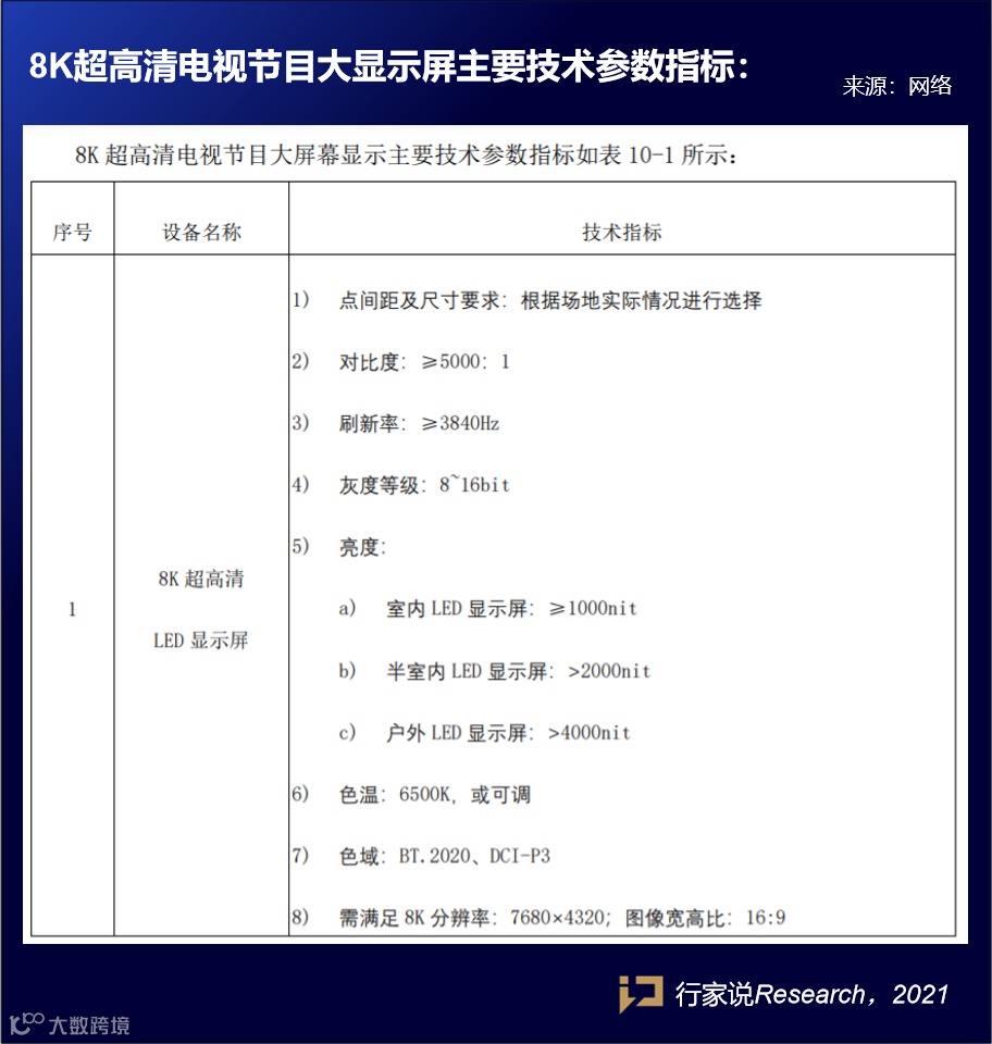 其中,8K超高清电视节目大显示屏主要技术参数指标主要有点间距以及尺寸、对比度、刷新度、灰度等级、色温、色域、需要满足8K分辨率的要求。