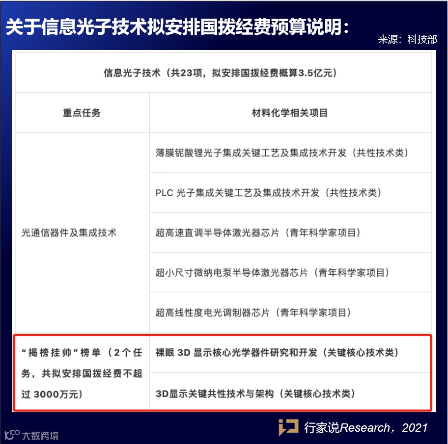 其中,裸眼3D显示核心光学器件和共性技术与架构的关键技术研发被纳入榜单之中。