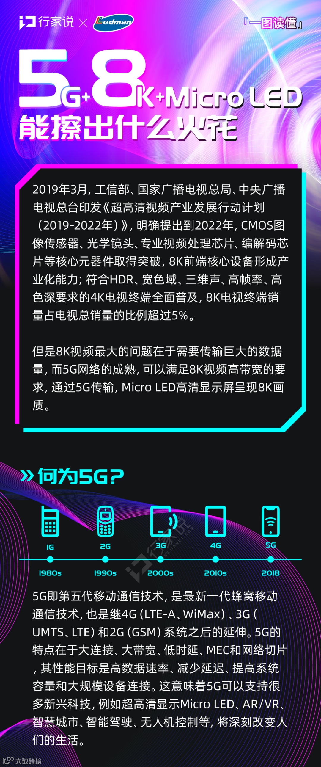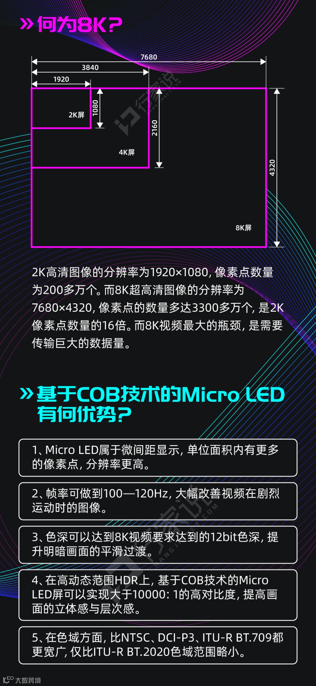 但是8K视频最大的问题在于需要传输巨大的数据量。而5G网络的成熟,可以满足8K视频高带宽的要求。而通过5G传输,Micro LED高清显示屏呈现8K画质。
