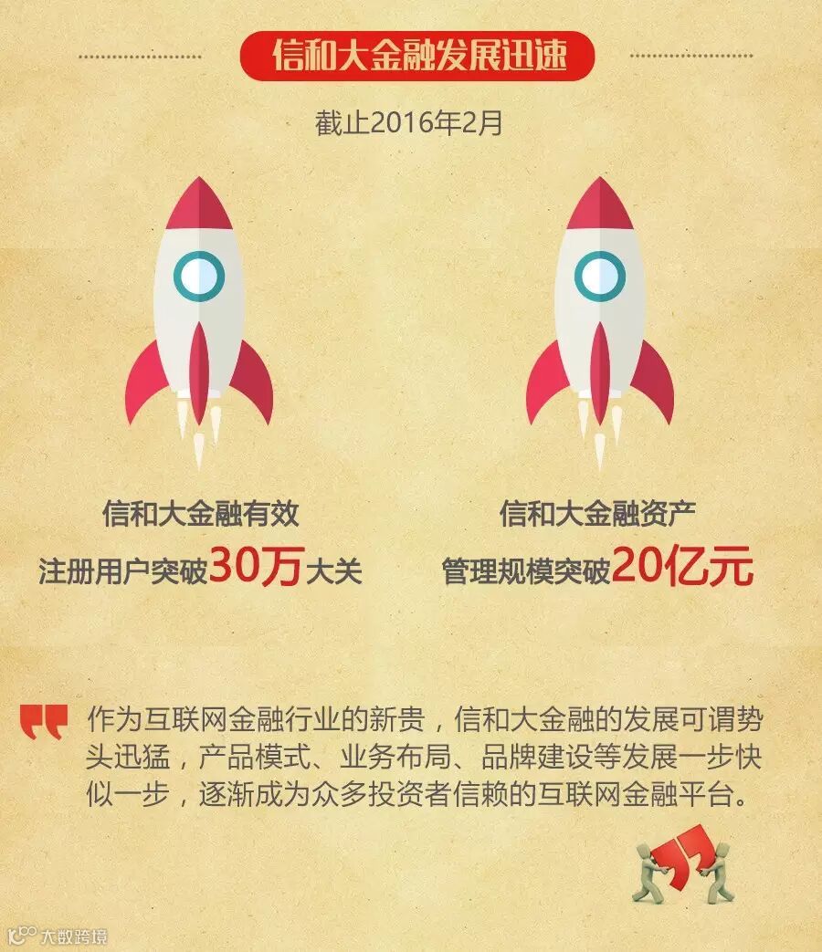 随着国家经济新常态以及利率市场化、汇率市场化的稳步推进,2015年成为了互联网金融大发展的一年,投资人数和交易量屡创新高。截止2015年12月底,互联网金融投资人数达到586万人,较2014年增长405%,累计成交量13652亿元,相比 2014年增长 288.57%。面对发展潜力如此巨大的市场,信和大金融通过不断提升自身硬件设施、优化整合资源,获得了长足的发展。截止2016年2月,信和大金融资产管理规模突破20亿元,获得了数十万合格投资者的认可。