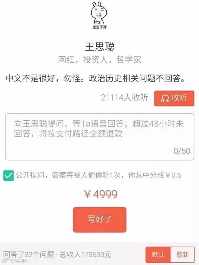 老公:投资标准:1、作为一个商人,会投资一些在短期、中期能得到财务回报的(项目)。有一些可能我自己不太认可,但是是市场上认可的,我也会投。2、作为艺术家,我会投资一些有意思的,或者长期对人类有所帮助、对社会有所改变的(项目),比如尖端的科技、生物、医疗等。3、我不会追求热点,因为很多热点都是我最先创造、或是发现的,比如像直播等。