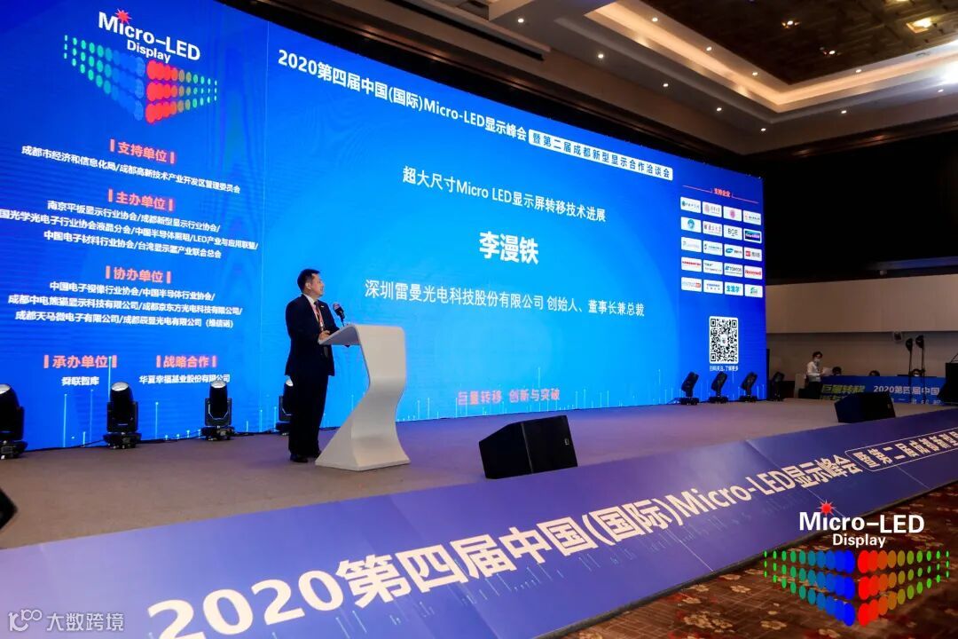 深圳雷曼光电科技股份有限公司创始人、董事长兼总裁李漫铁出席Micro-LED显示高峰论坛并发表《超大尺寸Micro LED显示屏转移技术进展》演讲。